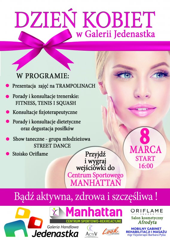 Zapraszamy na Dzień Kobiet w Galerii Jedenastka. To szczególne wydarzenie upłynie pod hasłem „Bądź aktywna, zdrowa i szczęśliwa!”. Będziemy mogli m.in. spróbować swoich sił na trampolinach, zasięgnąć porad specjalistów z Centrum Sportowo - Rekreacyjnego MANHATTAN w dziedzinach zdrowego żywienia, fitnessu, squasha, tenisa czy fizjoterapii oraz wygrać wartościowe vouchery.
