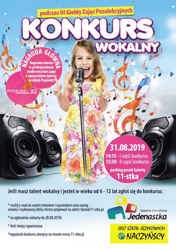 Zapraszamy dzieci w wieku od 6 - 12 lat do wzięcia udziału w konkursie wokalnym podczas III Lublinieckiej Giełdy Zajęć Pozalekcyjnych. Uważasz, że masz talent wokalny? Chcesz zaprezentować swoje umiejętności przed publicznością? Zgłoś się do konkursu! Wyślij e-mail na adres: biuro@11-stka.pl z imieniem i nazwiskiem uczestnika oraz utworem i wykonawcą, który będziesz śpiewać. Do wygrania nagranie własnej piosenki lub covera w profesjonalnym studiu nagrań oraz kurs lekcji śpiewu z nauczycielem Akademii Umiejętności PasjonART